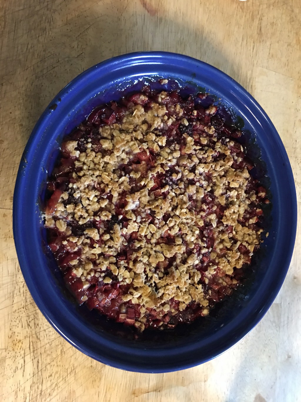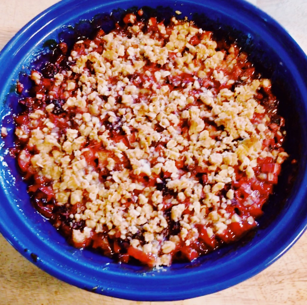 Anyways, we also had an abundance of rhubarb and while I already had plans to make a rhubarb crisp I had the bright idea to add some raspberries, cause why not? I used a recipe I have had for a while that I have made my own, not sure where I got the original as it is now handwritten into a cookbook I have had since I was 19.