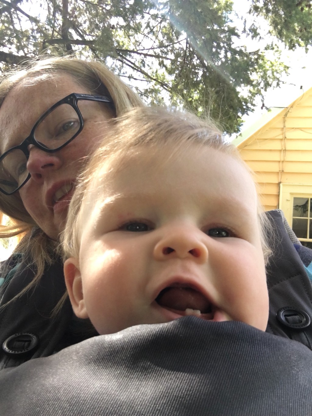 Today, my niece Sofi had spent the night and after breakfast we decided it was a great day to harvest some front yard bounty. Sunny but slightly overcast with the perfect breeze. I put Ethan in the Ergo baby carrier and off to the front yard to harvest fresh raspberries! I decided to take a little bit of raspberry, mush it up and let Ethan try it. Ethan is my 7 mos old son who tries a bit of everything and so far it is hit and miss depending on the day. Well, he was facing out and I reached around and tried to put a little in his mouth and met some resistance, then I felt an eyelash! Oooops! I craned my neck to make sure he was ok and sure enough he had protected his eye but had red raspberry smeared above and below his eye like a warrior ready for battle. Once I realized he was okay, phew, I couldn’t stop laughing long enough to tell Sofi. Poor babe! Probably set back the trust vs. mistrust growth stage, never know when your mother is going to stick food in your mouth let alone your eye!